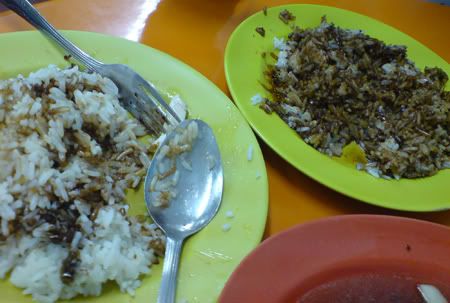 Here's our chicken rice's rice. It's not colored in any way because you're supposed to see the contrast. The white rice is mine and the black one is hers. She put the black sauce like... like put soup. A LOT SIO!